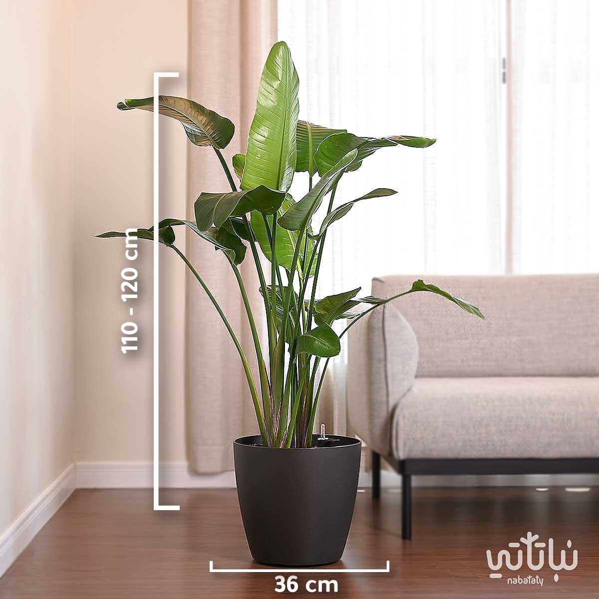 Bird of Paradise in a gray self-watering pot.The Bird of Paradise is a plant with beautiful leaves that needs bright lighting and indirect sunlight. Normally, there are cracks in its leaves.