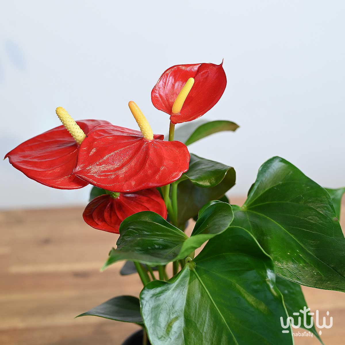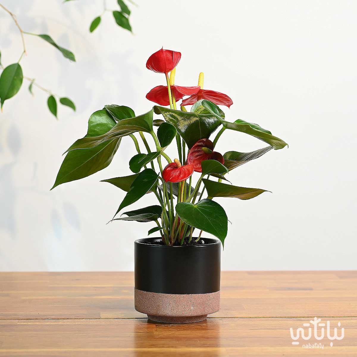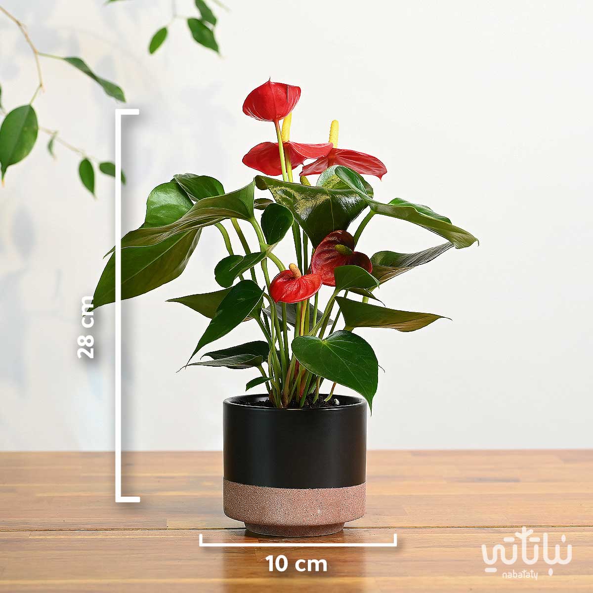 نبتة انتوريوم بأزهار حمراء في اصيص أنيق من السيراميك باللون الاسود ، تتميز بزهورها المشرقة وأوراقها الخضراء الزيتية الجميلة. تعرف باسم زهرة البشروس أو زهرة الغلام. هذه النبتة مثالية لتزيين المداخل أو صالات الجلوس، حيث تضيف لمسة من الأناقة والجمال الطبيعي إلى أي مساحة داخلية.