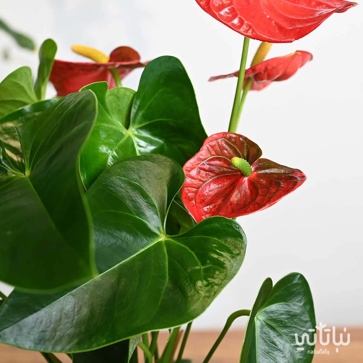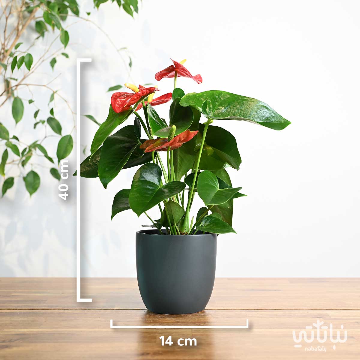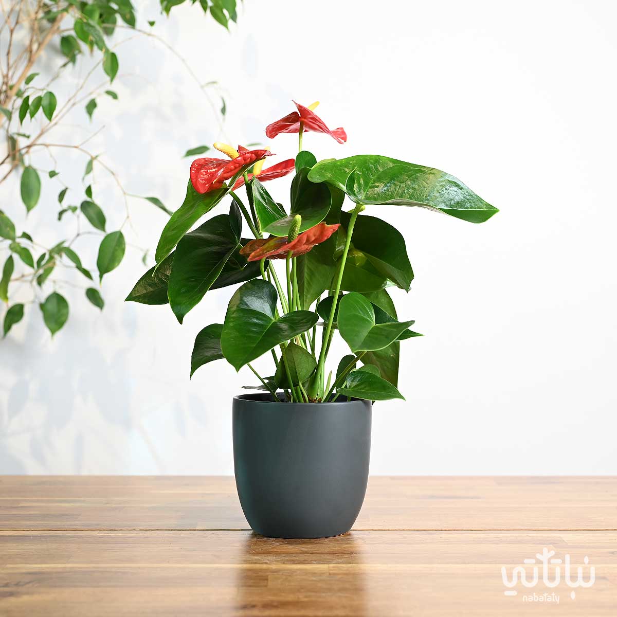 نبتة انتوريوم بأزهار حمراء في اصيص أنيق من السيراميك باللون الرمادي ، تتميز بزهورها المشرقة وأوراقها الخضراء الزيتية الجميلة. تعرف باسم زهرة البشروس أو زهرة الغلام. هذه النبتة مثالية لتزيين المداخل أو صالات الجلوس، حيث تضيف لمسة من الأناقة والجمال الطبيعي إلى أي مساحة داخلية.
