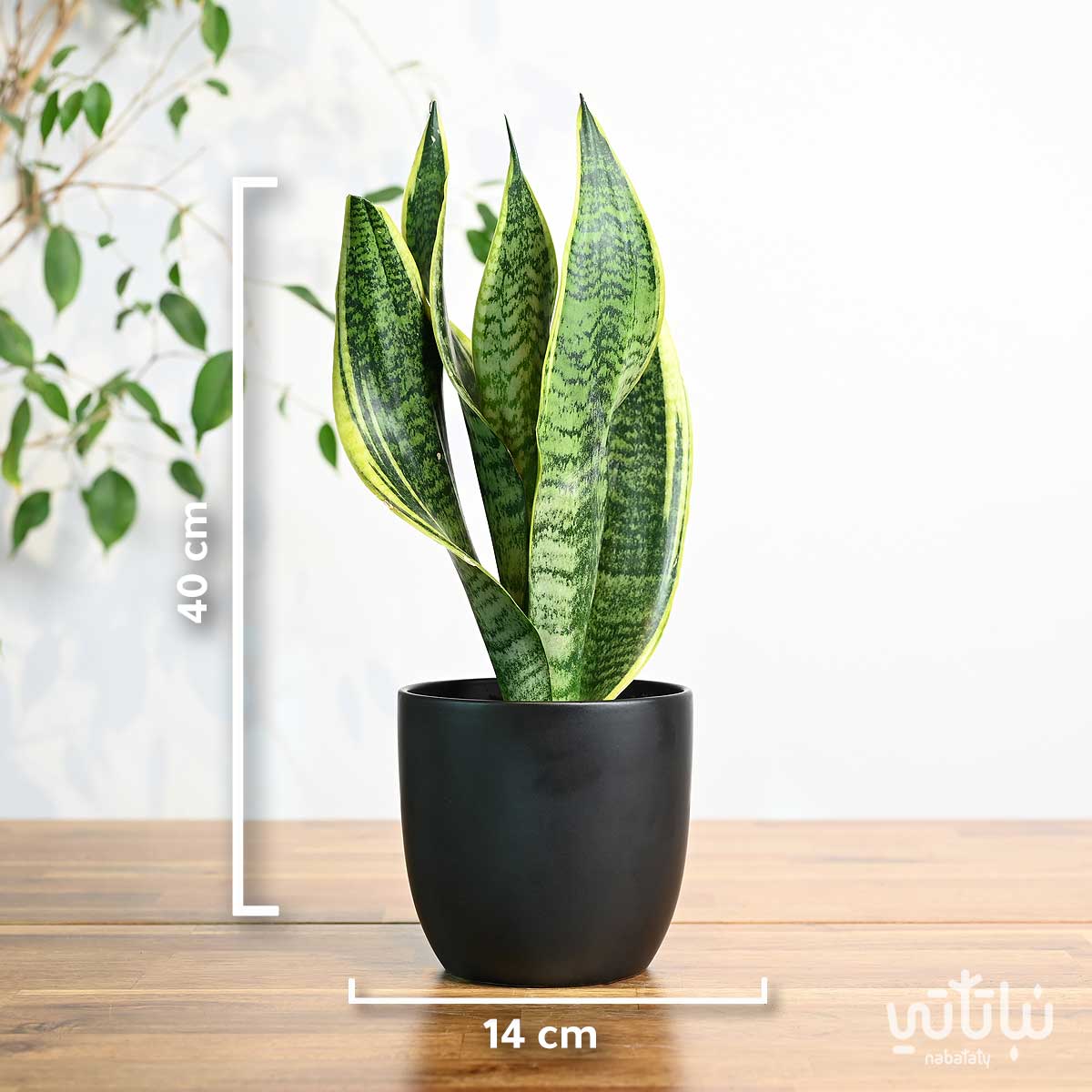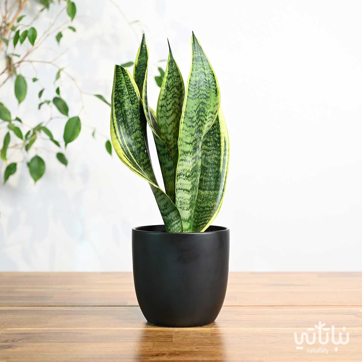 نبتة جلد النمر في اصيص من السيراميك باللون الاسود بشكل أنيق.