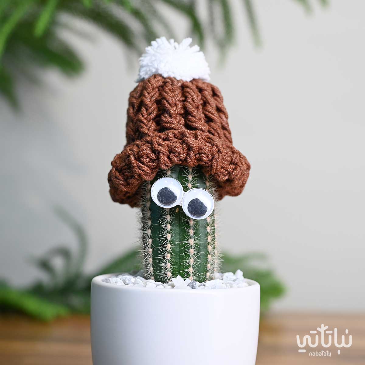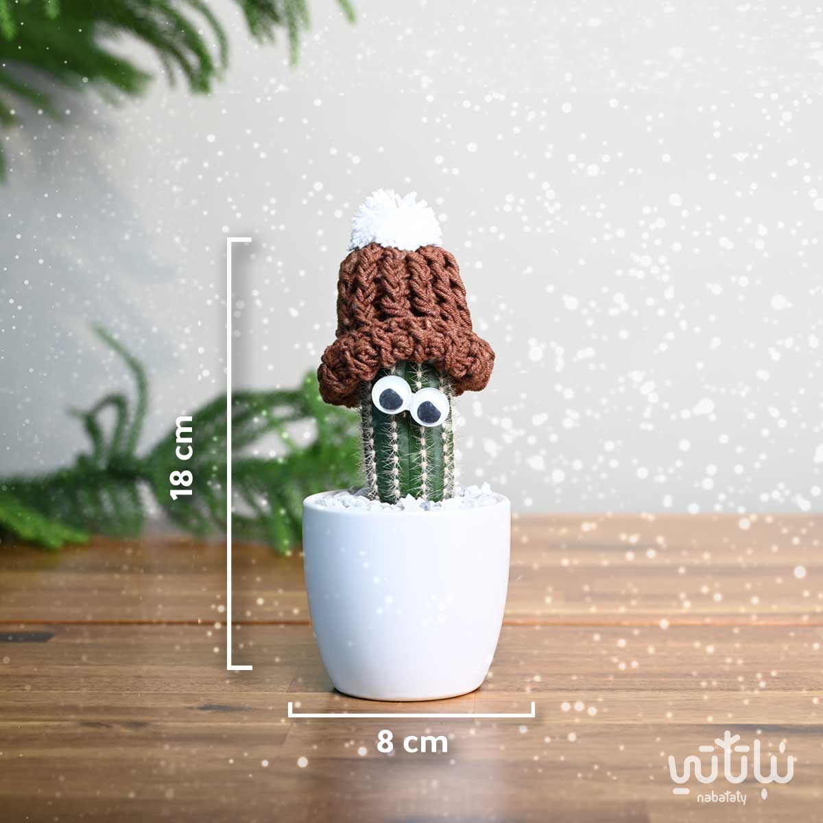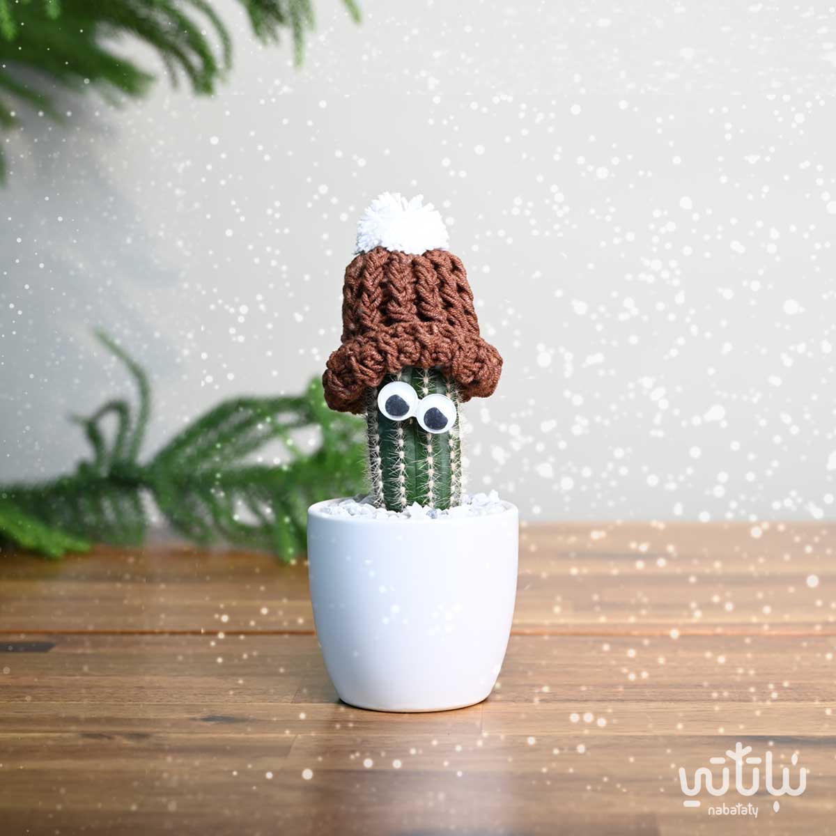نبتة صبار صغيرة مزينة بعيون في اصيص من السيراميك باللون الابيض و على التربة حجر زينة صغير موزع بشكل أنيق ، مزين أعلى الصبار بقبعة من الكروشية اليدوية باللون البني. تعتبر هدية مثالية مناسبة لأيام فصل الشتاء والليالي الباردة.