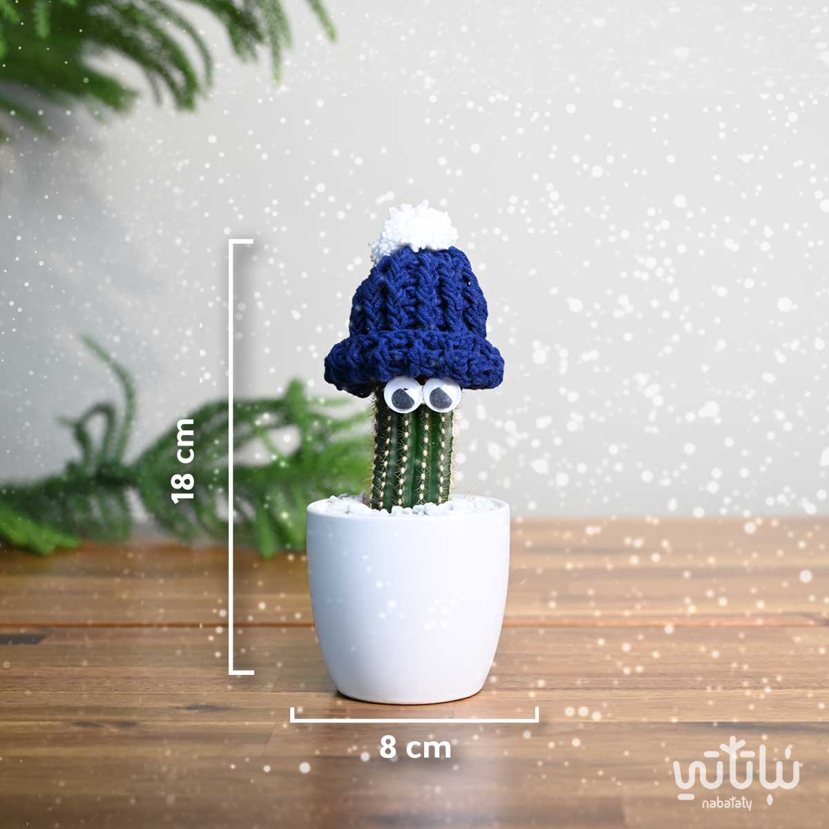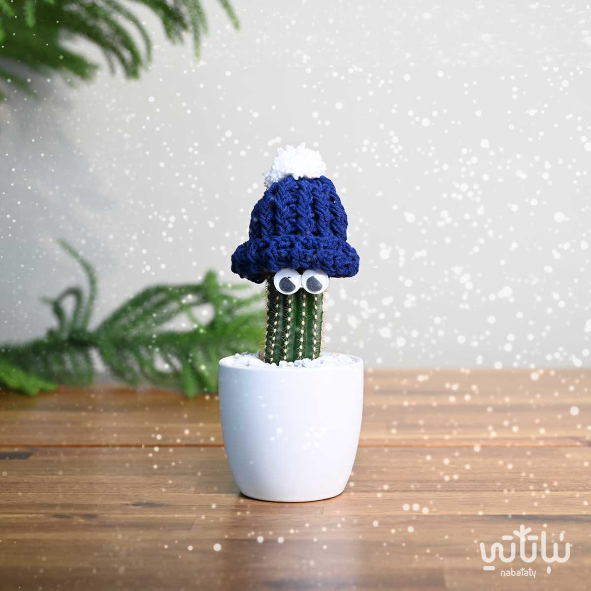نبتة صبار صغيرة مزينة بعيون في اصيص من السيراميك باللون الابيض و على التربة حجر زينة صغير موزع بشكل أنيق ، مزين أعلى الصبار بقبعة من الكروشية اليدوية باللون الازرق. تعتبر هدية مثالية مناسبة لأيام فصل الشتاء والليالي الباردة.