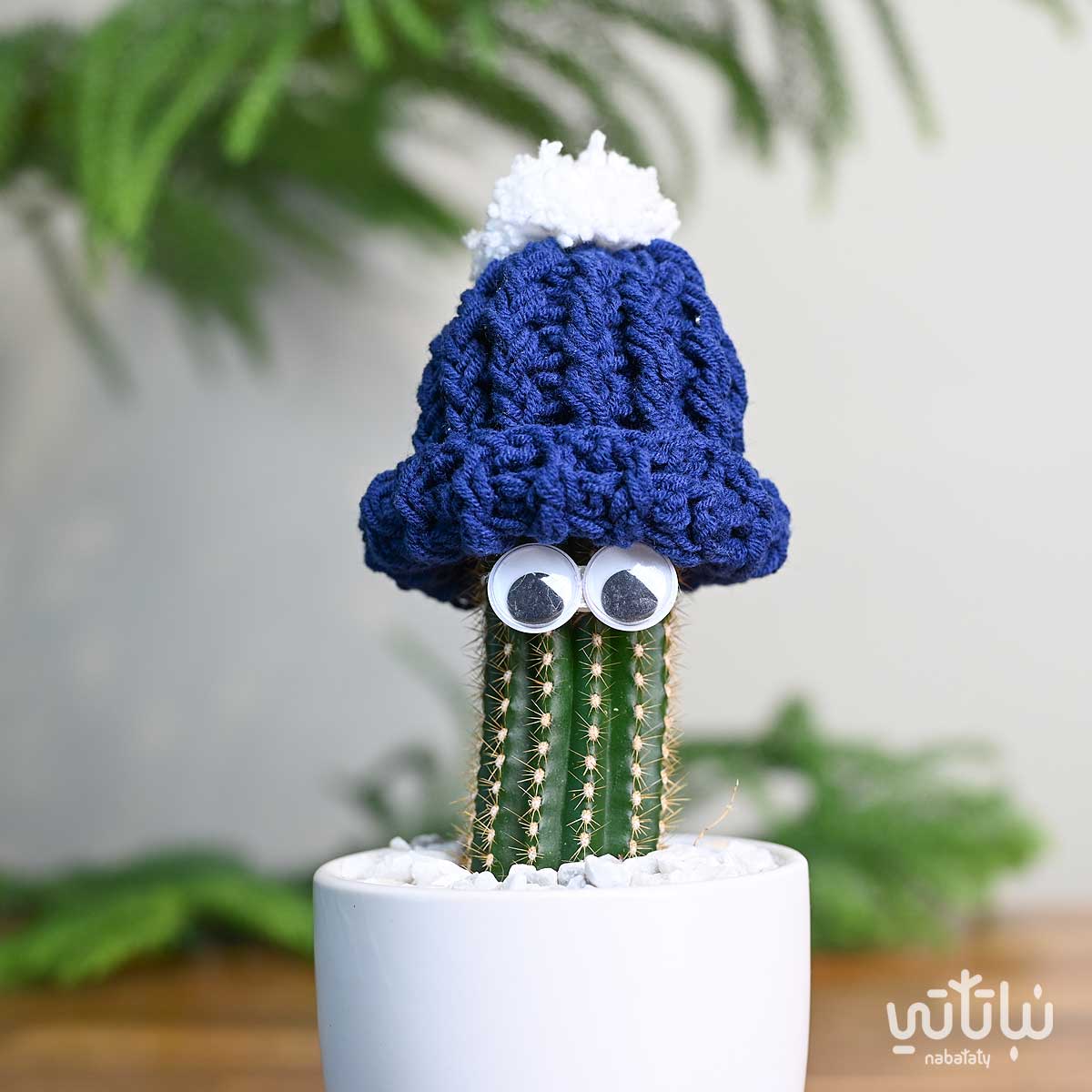 نبتة صبار صغيرة مزينة بعيون في اصيص من السيراميك باللون الأبيض و على التربة حجر زينة صغير موزع بشكل أنيق ، مزين أعلى الصبار بقبعة من الكروشية اليدوية باللون الازرق .