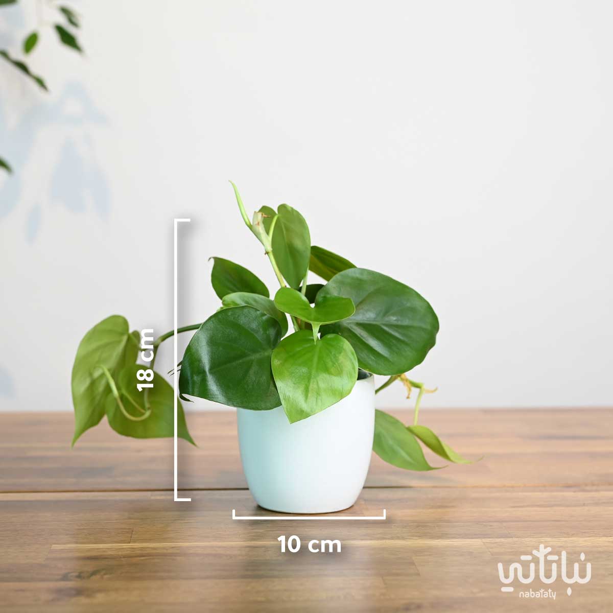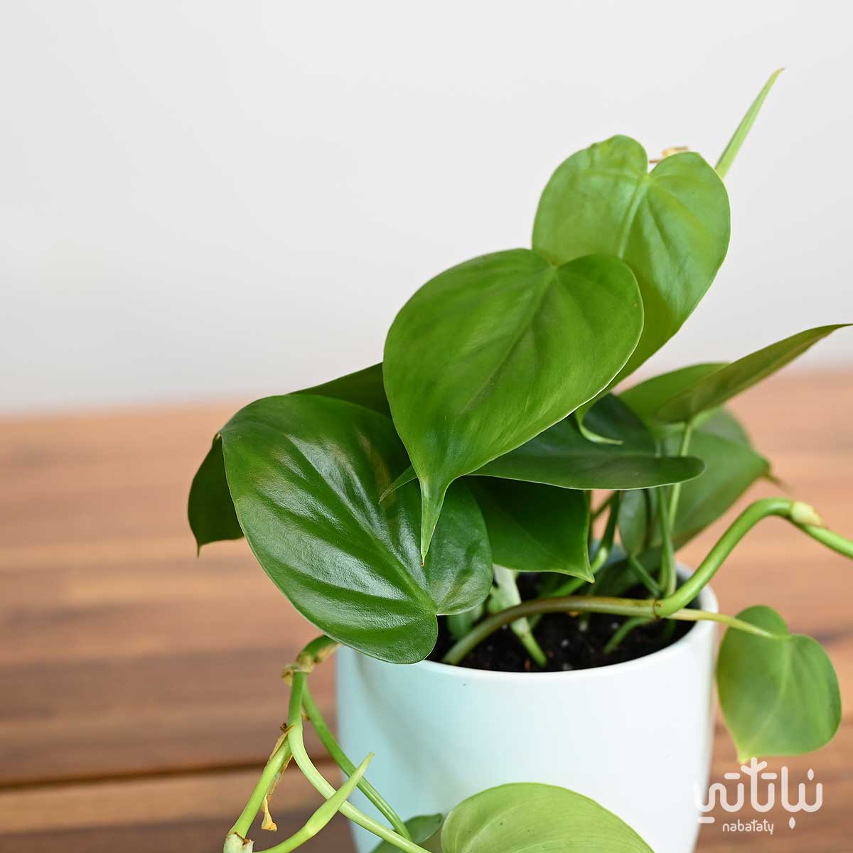 نبتة كرمة المحبوب بأوراقها الخضراء في اصيص سيراميك باللون الابيض. من النباتات سهلة العناية يمكن وضعها في غرف النوم ، صالات الجلوس أو حتى في المكاتب.